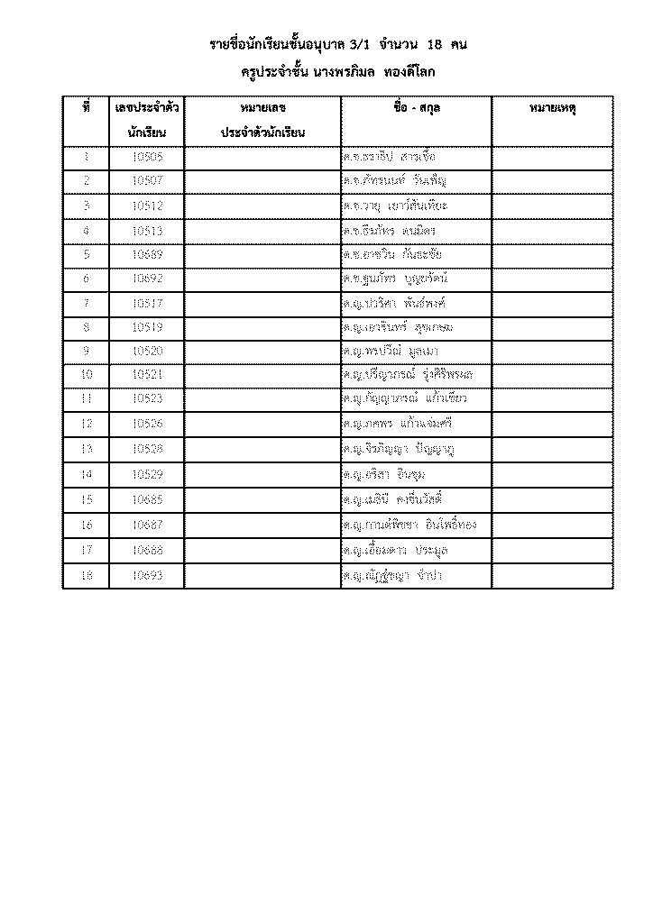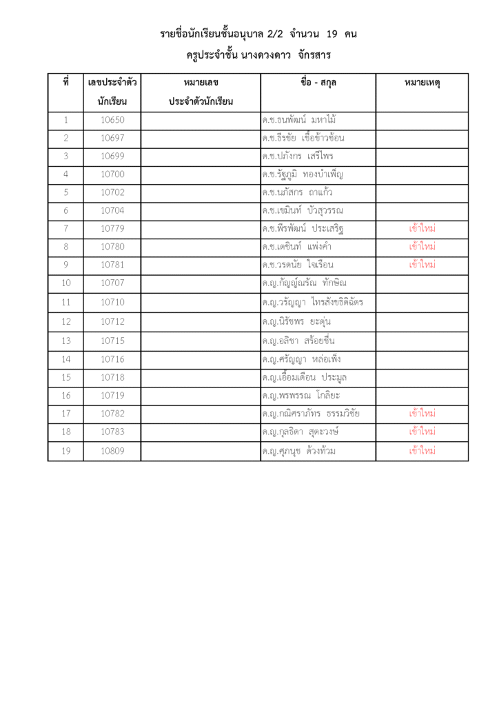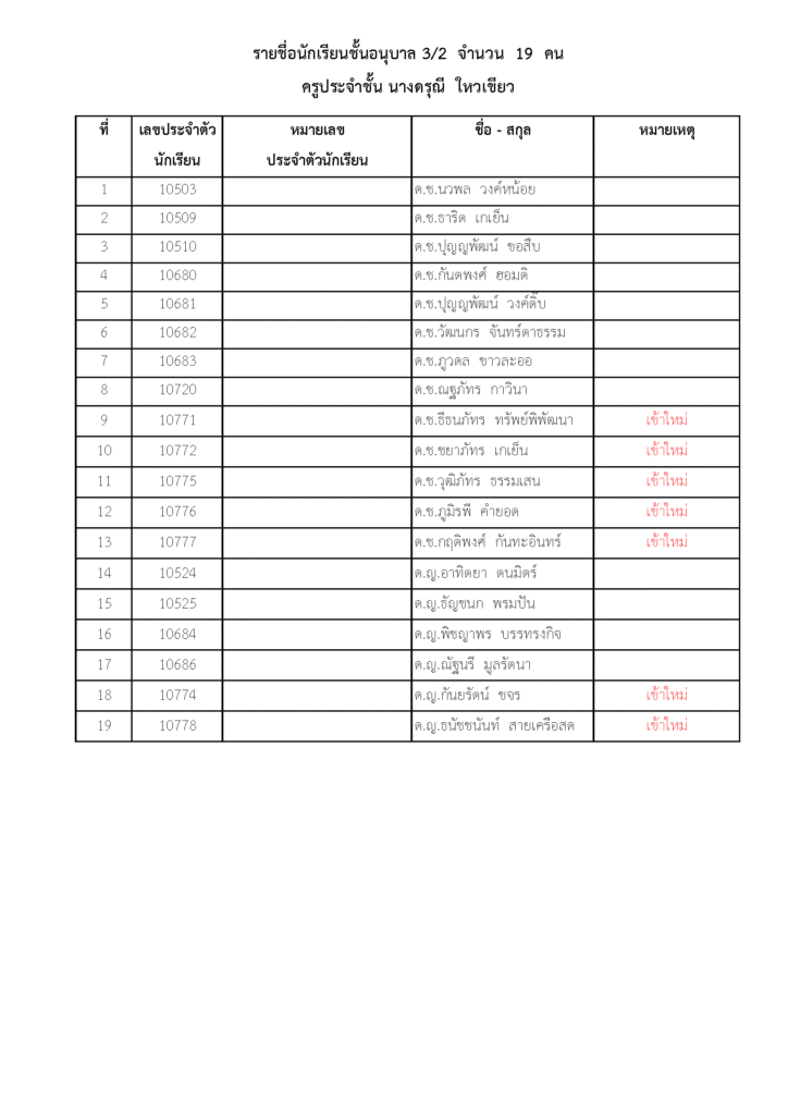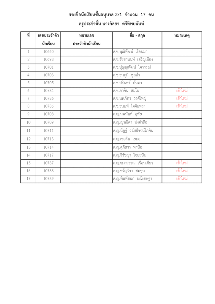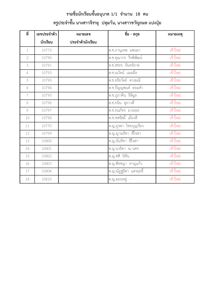รายชื่อนักเรียนชั้นอนุบาล ภาคเรียนที่ 1/2568